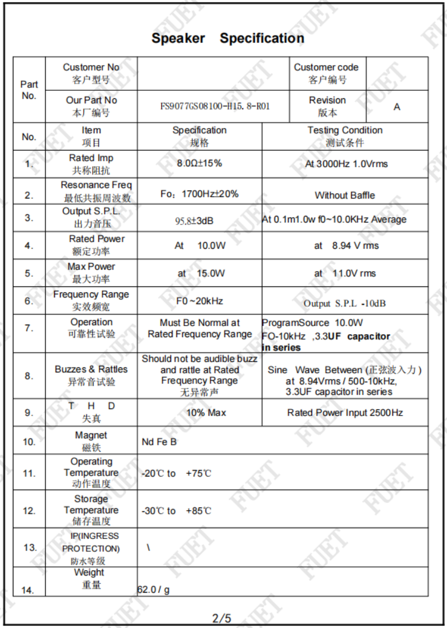 | 阻抗 | 8.0Ω±15% | At 3000Hz 1.0Vrms |